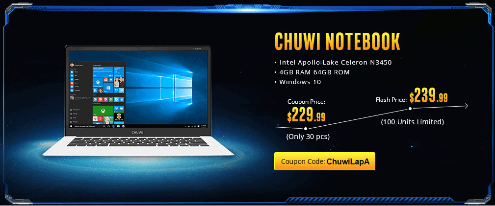 20 units of the Chuwi Lapbook is qualified for the coupon code ChuwiLapA at a price of $229.99. After the coupon is exhausted an additional 100 units will be sold for $239.99 in a flash sale.