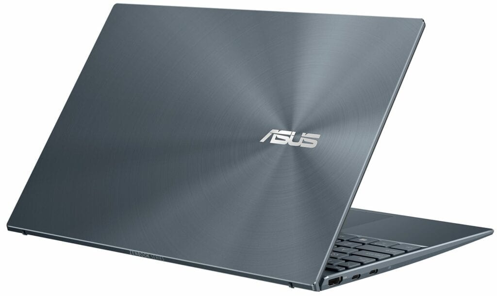 The Zenbook 13 UM325 sports a textured finishing for the lid with brushed concentric circles surrounding the glossy silver Asus logo on the right-hand side.
