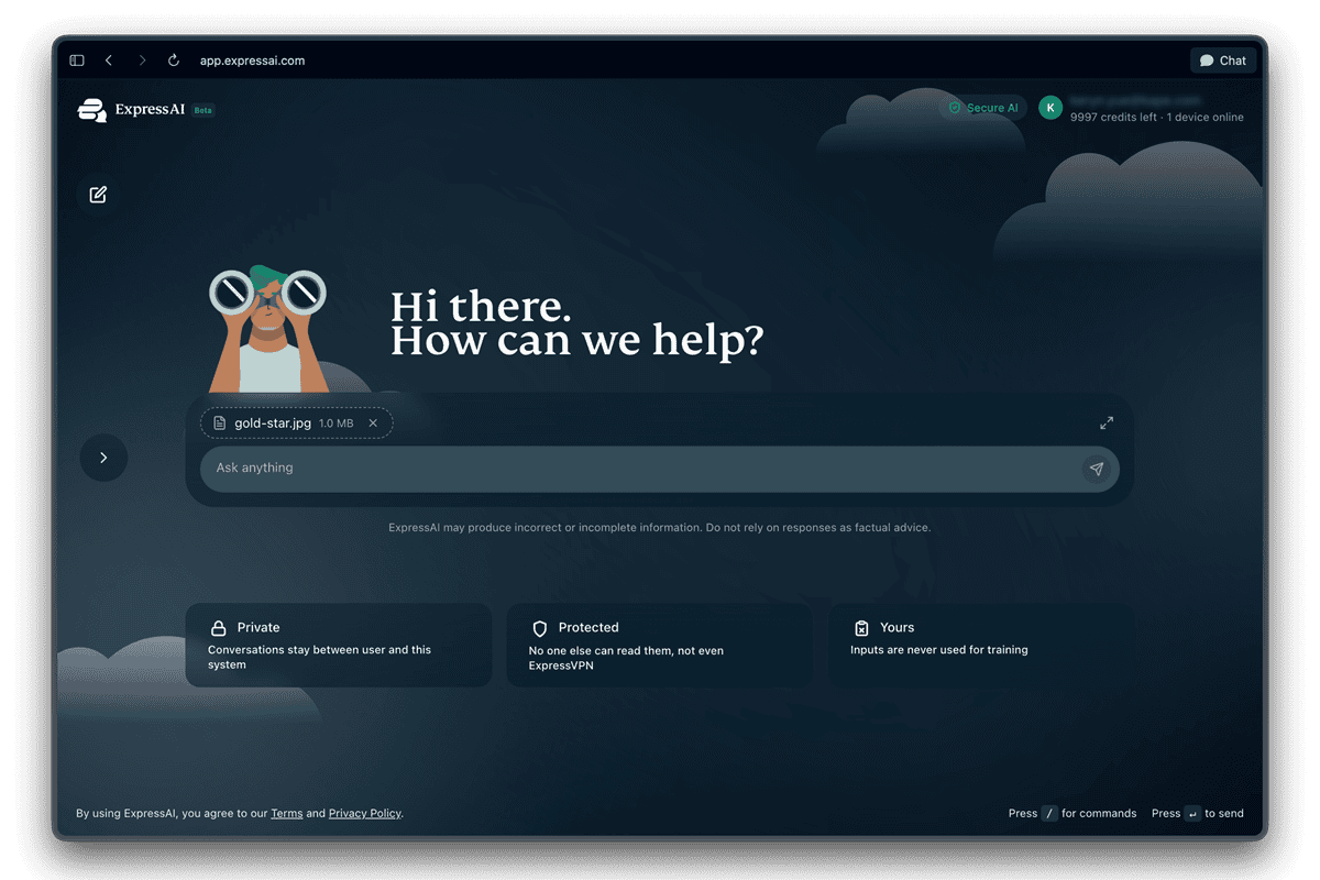 ExpressAI is a privacy-first AI platform from ExpressVPN, built on confidential computing, so no one, not even ExpressVPN itself, can access your conversations.