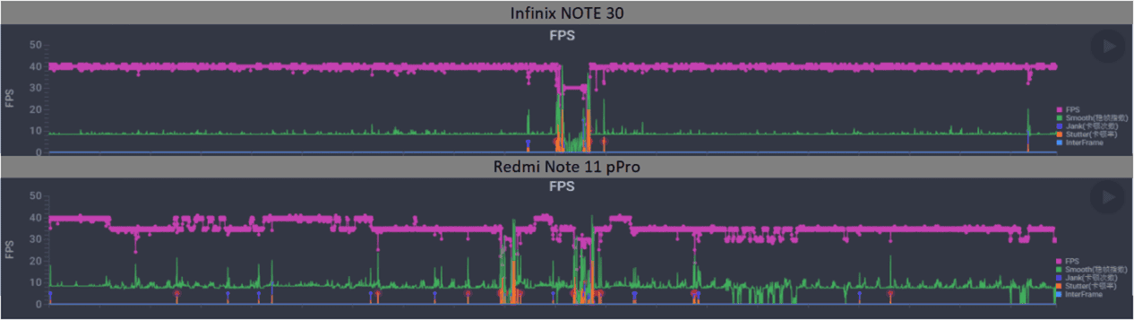 To better evaluate the performance and thermal control of the Infinix NOTE 30 and Redmi Note 11 Pro, actual testing was conducted while running the game “PUBG Mobile” with identical settings. The Infinix NOTE 30 delivered a lag-free experience with a consistently smooth average frame rate close to 40 frames.