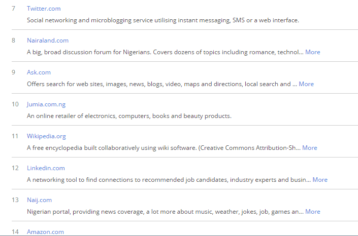 Nairaland ranked 8th is the only gist website currently ahead of Jumia. Jumia is ahead of naij (ranked 13th), Linda Ikeji (ranked 15th), and Vanguard (ranked 17th). Konga, Jumia’s only competitor (at least for now) is currently ranked 16th.
