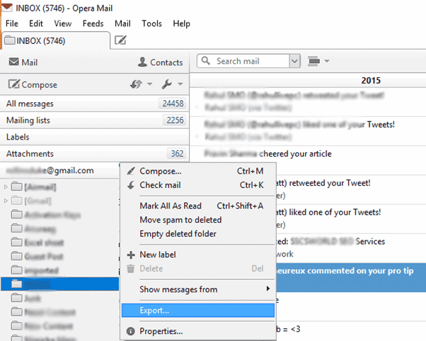 Opera Mail email client offers facility to export emails in MBS format, which is similar to MBOX format. Run Opera Mail, select any email folder and right click on the folder to export Opera Mail emails into MBS format.